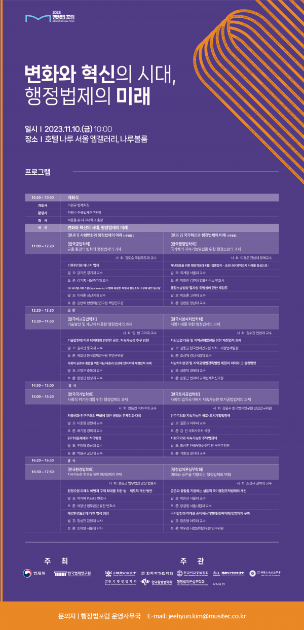 2019년부터 해마다 개최되어 온 ‘행정법 포럼’은 정부와 학계가 함께 행정법·공법 분야의 여러 성과를 공유하고 보다 나은 행정법제의 미래를 모색하기 위한 방향을 논의하는 공동학술대회로서 올해는 8개의 행정법·공법 학회가 참가했다.