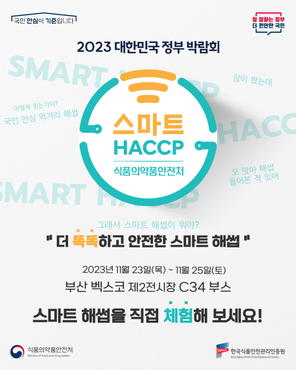 [Q뉴스] 식품의약품안전처와 한국식품안전관리인증원은 11월 23일부터 25일까지 부산 벡스코에서 개최되는 ‘2023 대한민국 정부 박람회’에 참가해 스마트 해썹 홍보관을 운영한다.