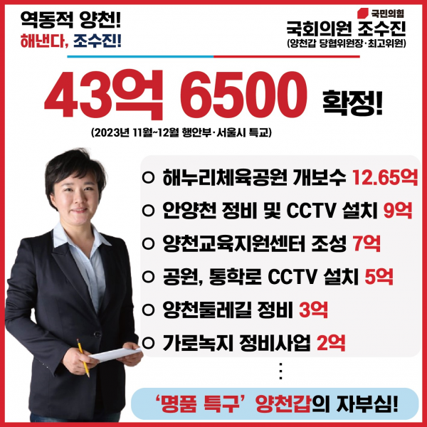 [Q뉴스] 조수진 국회의원은 지난 11월부터 12월 현재까지 행정안전부와 서울시로부터 확정된 양천구 특별교부금이 총 43억 6500만원에 달한다고 밝혔다.