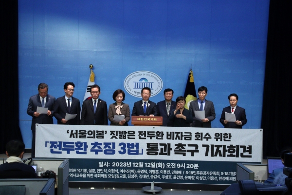 [Q뉴스] 12일 국회 소통관에서 더불어민주당 이용빈, 설훈, 안민석, 유기홍, 이형석, 이수진 의원과 올바른 역사 교육을 위한 국회의원 모임, 5·18민주유공자유족회, 5·18기념재단 관계자들이 전두환 비자금 회수를 위한 ‘전두환 추징3법’ 통과 촉구 기자회견을 가졌다.