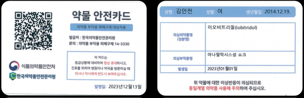 식약처는 그간 장애 보상금, 진료비 등 피해구제급여를 지급한 환자에게 부작용 피해 재발 방지를 위해 환자 인적 사항 부작용 발생 원인 의약품 부작용명 부작용 발생일 발행일 QR코드가 기재된 실물 ‘약물 안전카드’를 발급·제공해 왔다.