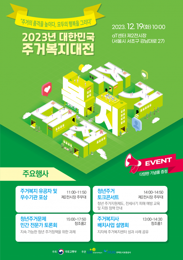 국토교통부는 12월 19일 오전 10시부터 오후 6시까지 서울 양재 aT센터에서 ‘2023 대한민국 주거복지대전’을 개최한다.