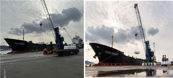 [Q뉴스] 우리 기업이 제3국과 계약한 물량 중 베트남에서 수입한 요소 5,500톤이 12월 16일 오전 울산항 2부두에 입항해 하역을 시작했다.