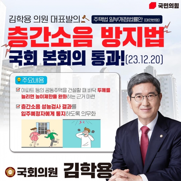 김학용 의원은 “이웃간 갈등을 야기하는 층간소음은 더 이상 좌시할 수 없는 심각한 사회적 문제로 대두되고 있다”며 “이번 법안 통과로 층간소음 문제가 조금이나마 해결이 되어 국민들이 보다 편하게 살 수 있는 주거환경이 조성되는데 도움이 되길 바란다”고 소회를 밝혔다.