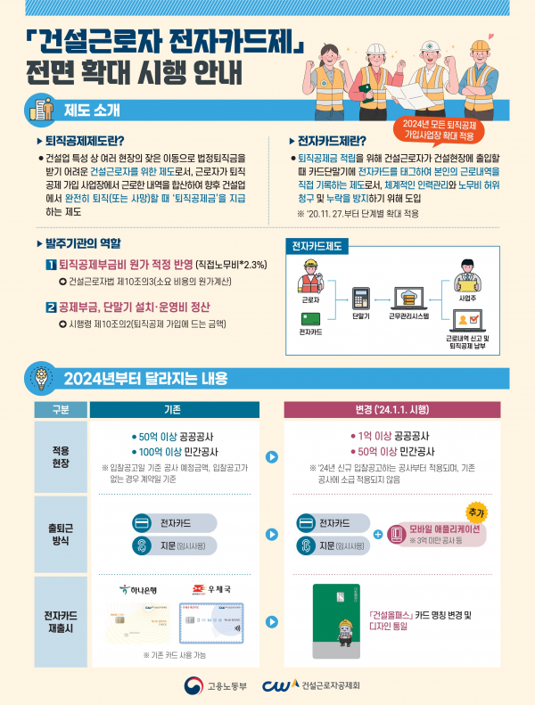[Q뉴스] 고용노동부와 건설근로자공제회는 ‘24.1.1.부터 건설근로자 퇴직공제 가입 대상이 되는 모든 건설공사에 전자카드제를 적용한다고 밝혔다.