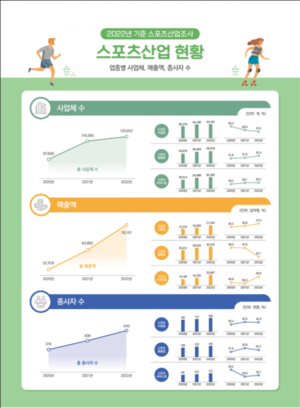 [Q뉴스] 문화체육관광부는 1월 4일 2022년 12월 기준으로 국내에서 스포츠산업을 영위하는 사업체를 대상으로 진행한 ‘스포츠산업조사’의 주요 결과를 발표했다.