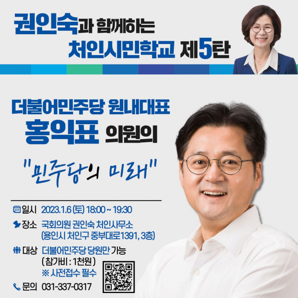 권 의원실에 따르면 작년 6월부터 진행되어 온 '처인시민학교' 5번째 강연자로 홍 원내대표를 초빙, '민주당의 미래'에 대해 민주당 당원들과 의견을 나눌 예정이다.