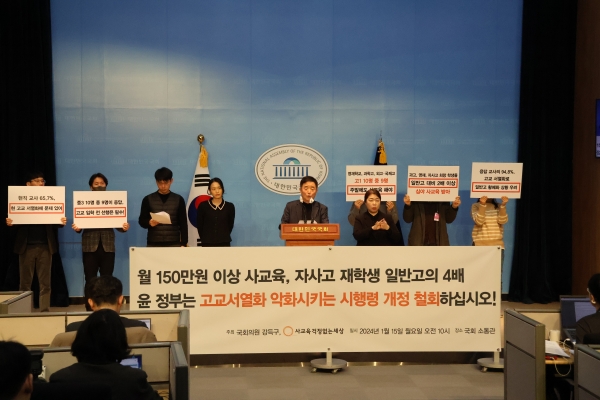 국회 교육위원회 소속인 강득구 의원 과 사교육걱정없는세상은 15 일 오전 9 시 40 분 , 국회 소통관에서 ‘2023 년 희망 고교 유형별 사교육 실태 조사 결과 발표 기자회견 ’ 을 개최했다.