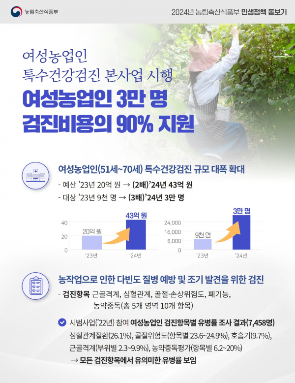 2022년부터 2년간의 시범사업에 이어 올해 본격적으로 시행하는 특수검진사업은 예산과 대상 여성농업인이 전년 대비 각각 2배와 3배이상 크게 늘어난 규모로 진행된다.