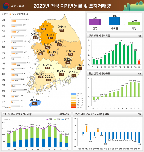 [Q뉴스] 국토교통부와 한국부동산원은 '23년 연간 지가변동률 및 토지거래량을 발표했다.