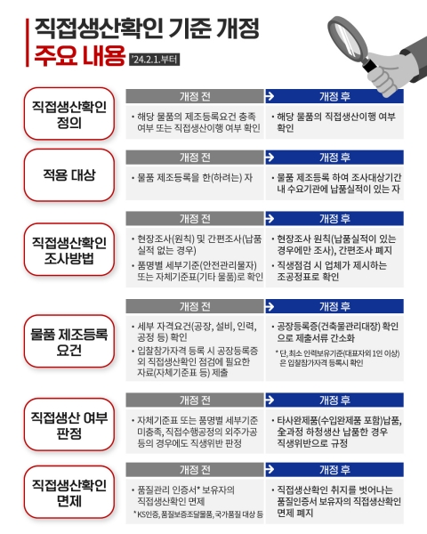 [Q뉴스] 조달청은 제조물품 조달청 입찰참가 등록 시 제출서류를 간소화하고 직접생산 점검방식을 대폭 개선하는 내용으로 ‘조달청 제조물품 직접생산확인 기준’을 개정, 2월 1일부터 시행에 들어간다.