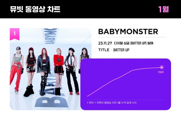 7일 글로벌 팬덤 플랫폼 뮤빗이 공개한 1월 동영상 차트에 따르면 베이비몬스터의 ‘BATTER UP’ 뮤직비디오가 12월에 이어 최다 조회 수를 기록하며 2개월 연속 1위를 차지했다.