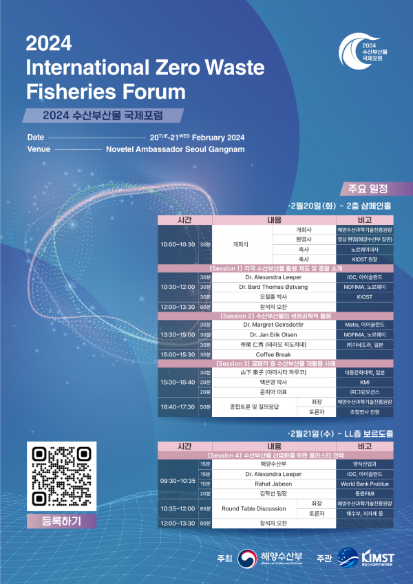 [Q뉴스] 해양수산부는 2월 20일부터 21일까지 서울 노보텔 앰배서더 강남에서 ‘2024 수산부산물 국제포럼’을 개최한다.