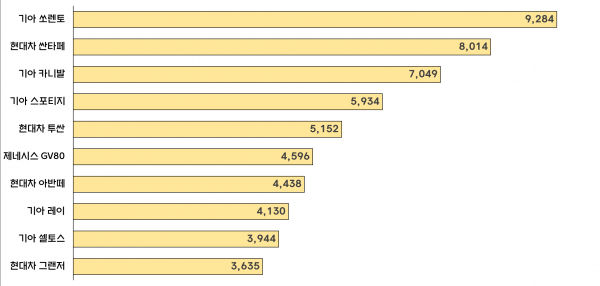한편 승용 기준 판매량 상위 5개 모델은 쏘렌토, 싼타페, 카니발, 스포티지, 투싼이며 국내 자동차 시장 내 스포츠 유틸리티 차량 등의 선호 현상이 뚜렷이 나타난 것으로 집계됐다.