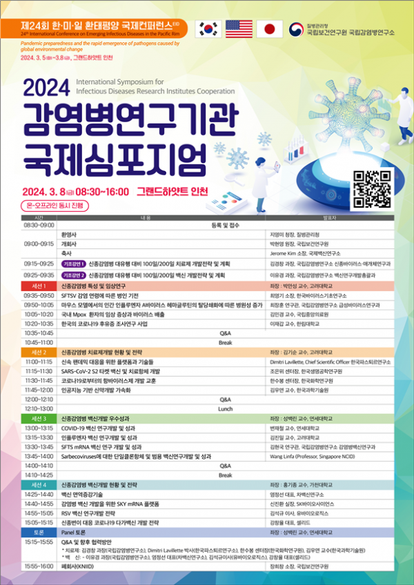 [Q뉴스] 질병관리청 국립보건연구원 국립감염병연구소는 2024년 환태평양 신종감염병 국제컨퍼런스를 3월 5일부터 8일까지 4일간 그랜드하얏트인천 호텔에서 개최한다고 밝혔다.