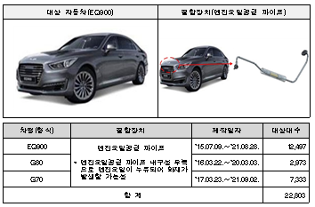 EQ900 등 3개 차종 22,803대는 엔진오일공급 파이프 내구성 부족으로 3월 13일부터, 포터2 13,457대는 엔진 구동벨트 장력 조절 장치의 고정볼트 설계 불량으로 3월 7일부터 시정조치에 들어간다.
