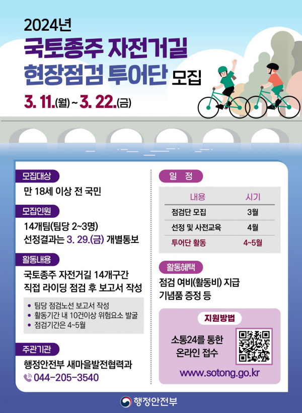 [Q뉴스] 행정안전부는 2024년 상반기 국토종주 자전거길 현장점검 투어단을 3월 11일부터 3월 22일까지 모집한다고 밝혔다.
