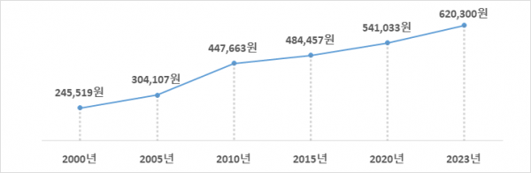 연금액 수준을 살펴보면 노령연금의 경우 1인당 월 62만원으로 2022년 58만 6천 원 대비 5.8% 늘었으며 지난 2000년 24만 6천 원 이후 매년 꾸준히 상승하고 있다.