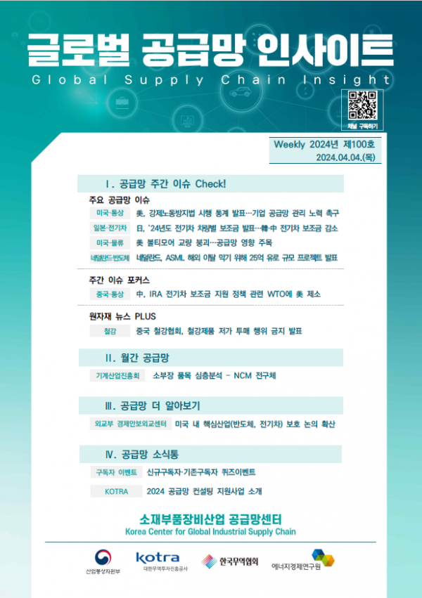 특히 이번 100호에서는 미국 강제노동방지법 등 최신 공급망 동향과 더불어 미국 내 핵심산업 논의 동향을 다루었다.