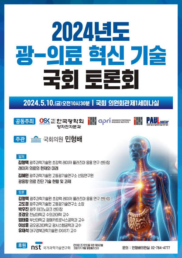이번 토론회는 GIST 고등광기술연구소, GIST 초강력레이저플라즈마 응용연구센터, 한국광학회 양전자전자분과가 공동 주최하며 국회 과학기술정보방송통신위원회 민형배 위원이 주관한다.