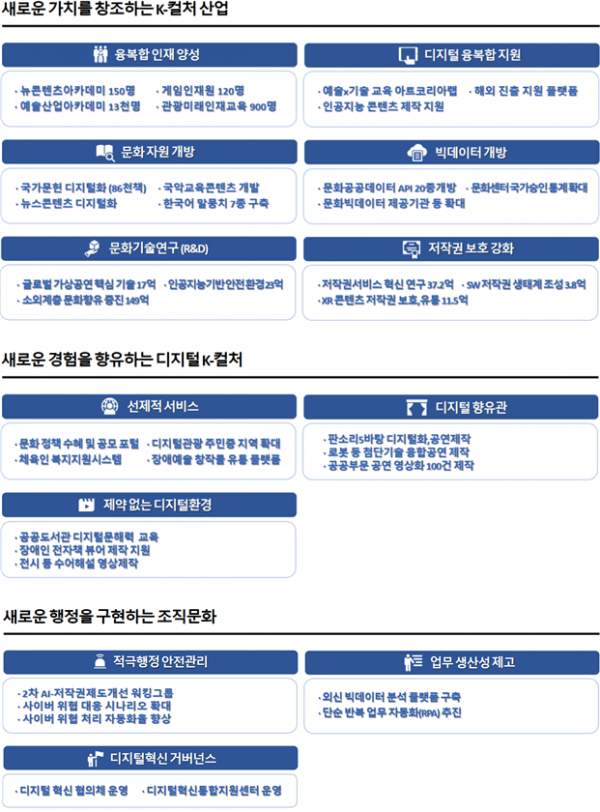 이를 통해 디지털 기반의 케이-컬처 산업을 육성하고 국민에게 새로운 문화 경험을 제공하며 이를 뒷받침하는 과학적 행정을 구현할 계획이다.
