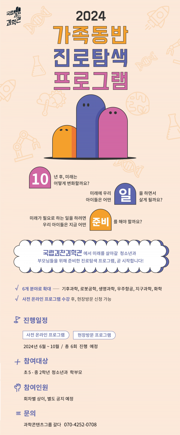 [Q뉴스] 국립과천과학관은 작년에 이어 올해 6월부터 10월까지 청소년과 학부모를 대상으로 ‘2024 가족동반 진로탐색 프로그램’을 운영한다.