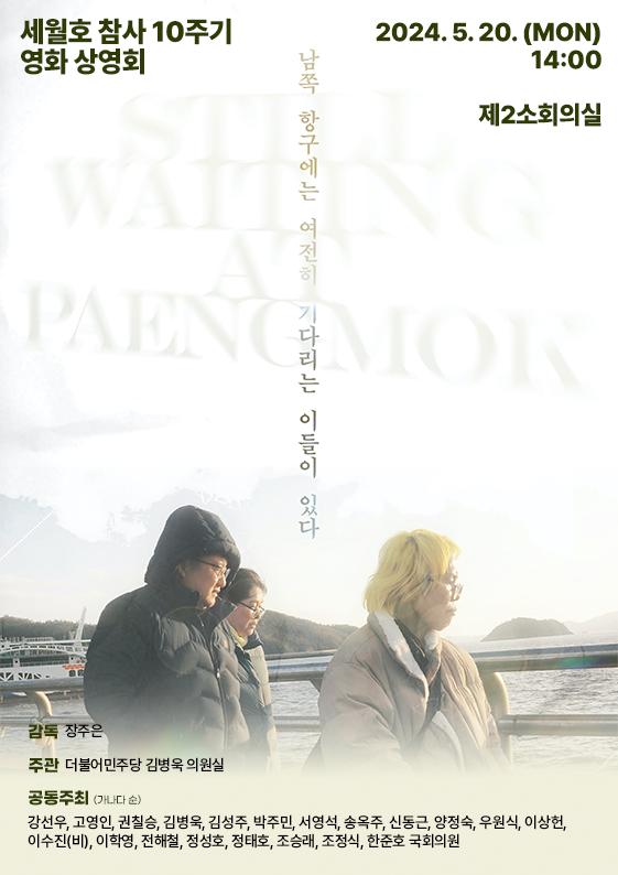 한편 국회 상영회에는 행사를 주관한 더불어민주당 김병욱 국회의원을 비롯해 우원식 국회의장 후보, 이학영 국회부의장 후보, 박찬대 더불어민주당 원내대표, 이재복 4.16 세월호 가족협의회 직무감사, 공동주최 국회의원, 장주은 감독, 관객들이 자리에 참석해 세월호 참사 10주기를 추모하고 영화를 함께 관람할 예정이다.