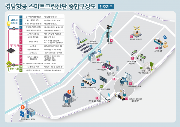 입주기업 지붕, 유휴부지 등에 태양광 발전 및 수소연료전지 발전소 설치 등을 통해 에너지를 절감하고 산업단지 내 스마트 횡단보도, 스마트 주차장, 스마트폴 등 스마트 교통·안전 인프라를 구축해 효율성과 안전성을 제고하는 한편 입주기업의 생산성 향상 지원을 위한 다양한 사업도 연계한다.
