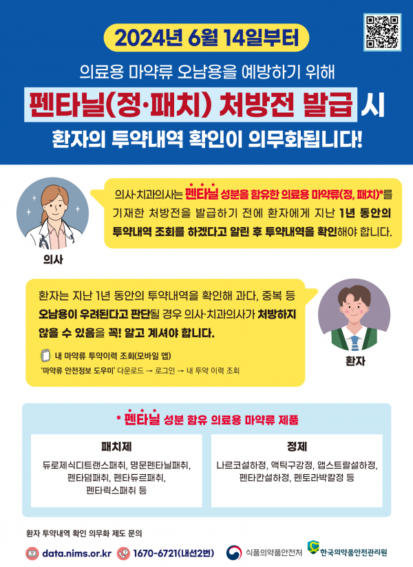 식약처 채규한 마약안전기획관은 “이번 제도 시행에 따라 환자가 여러 의료기관을 돌며 펜타닐 정제·패치제를 과다·중복으로 처방받는 것을 확인할 수 있게 되어 마약류 오남용이 줄어드는 계기가 될 것으로 기대한다”고 밝혔다.