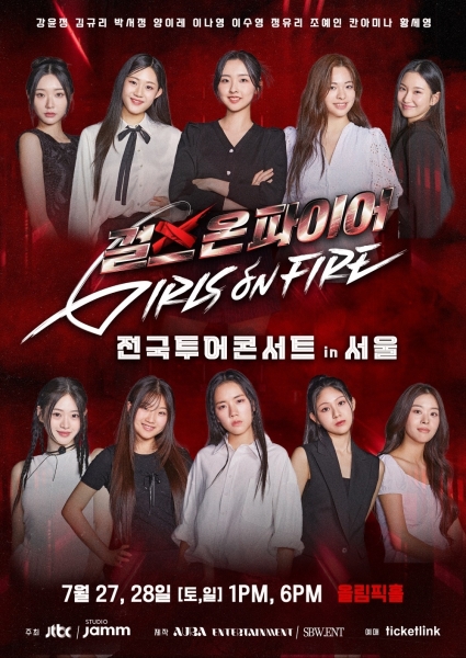 ‘걸스 온 파이어’는 매주 화요일 오후 10시 30분 방송되며 전국투어 콘서트 서울 티켓은 12일 오후 5시, 지방 티켓은 13일부터 티켓링크에서 단독으로 예매 가능하다.