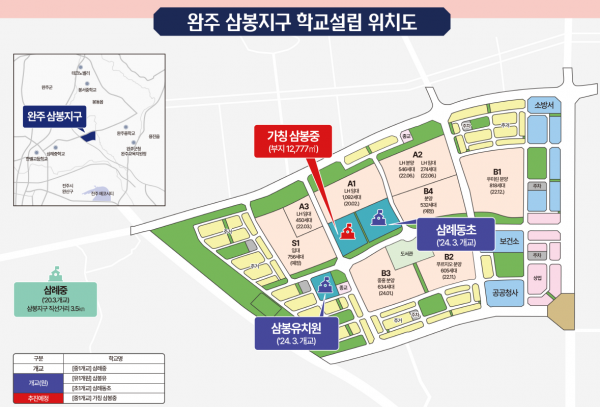 완주 삼봉지구는 대규모 아파트 개발사업에 따른 인구유입으로 학생수가 지속적으로 증가하고 있는 곳이다.