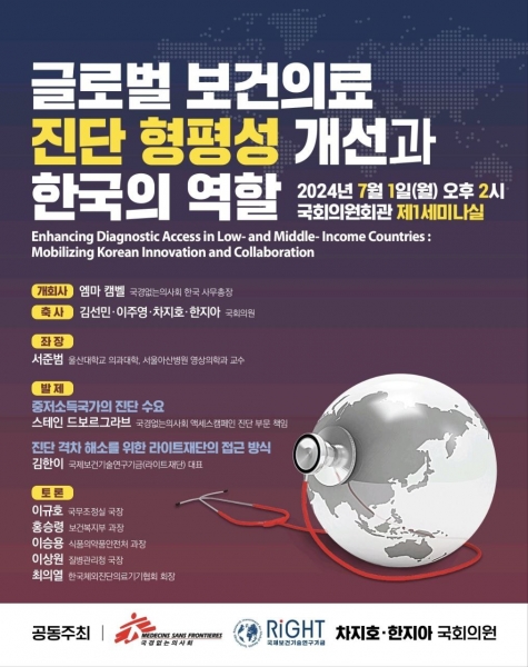 [Q뉴스] 더불어민주당 차지호 국회의원, 국민의힘 한지아 국회의원이 다음달 1일 오후 2시 국회 의원회관 제1세미나실에서 국경없는의사회, 국제보건기술연구기금과 함께‘글로벌 보건의료 진단 형평성 개선과 한국의 역할’주제로 세미나를 개최한다.