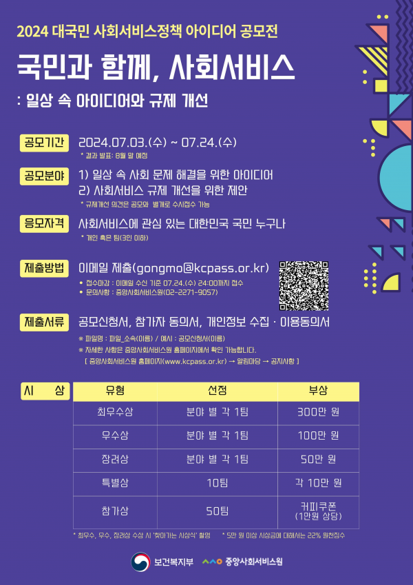 이를 위해 중앙사회서비스원은 7월 3일부터 7월 24일까지 일상 속 사회문제 해결을 위한 아이디어와 더불어 사회서비스 규제개선 의견에 대한 대국민 공모전을 개최해 국민들의 다양한 의견을 직접 받을 예정이다.