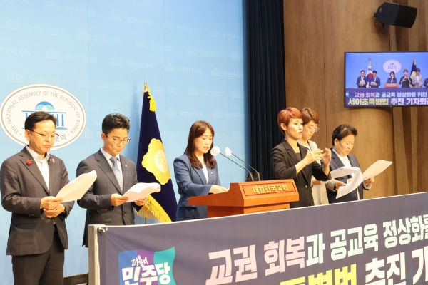 더불어민주당 교육위원회 위원들은 교육현장의 복합적 위기가 적나라하게 드러났었던 지난 서이초 사건의 1주기에 앞서 선생님들이 교육 현장에서 정상적으로 교육활동을 할 수 있도록 하기 위해 ‘서이초 특별법’ 입법을 추진한다고 밝혔다.