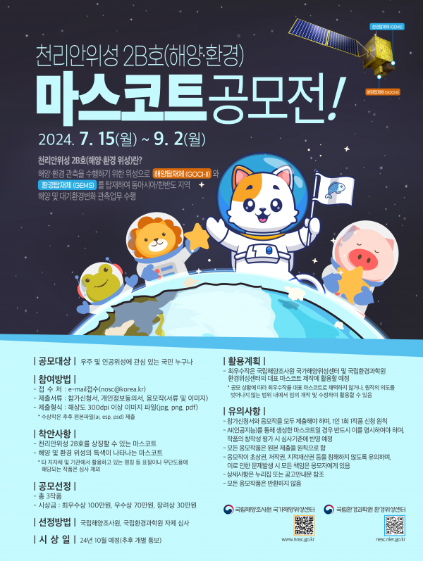 [Q뉴스] 해양수산부 국립해양조사원과 환경부 국립환경과학원은 7월 15일부터 9월 2일까지 천리안위성 2B호 마스코트 디자인을 공모한다고 밝혔다.