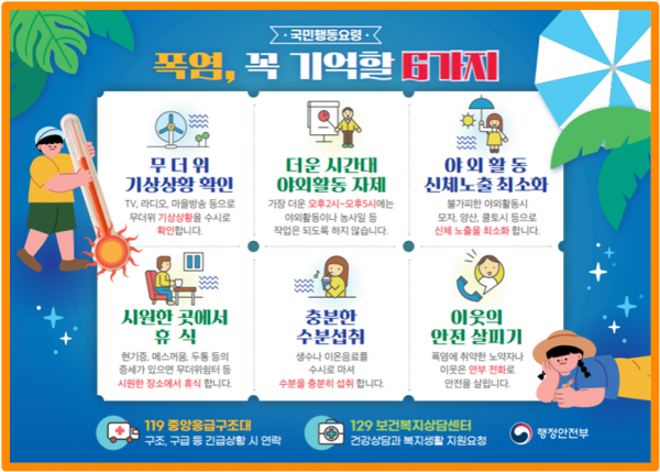 이한경 재난안전관리본부장은 “폭염 시 야외활동은 피하고 체감온도가 높아질수록 충분한 수분 섭취와 휴식으로 건강 먼저 챙겨야 한다”며 “특히 땡볕이 내리쬘 때 야외 작업은 물론, 논·밭과 비닐하우스에서의 농사일은 매우 위험하니 가급적 자제하는 등 국민행동요령을 지켜 건강한 여름 보내시길 바란다”고 말했다.