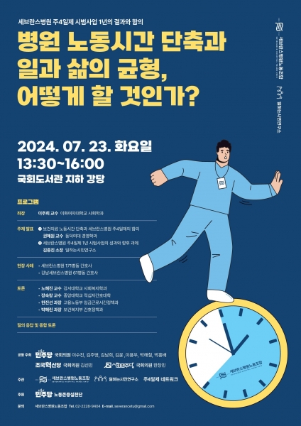 토론회는 권혜원 동덕여자대학교 경영학과 교수의 ‘보건의료 노동시간 단축과 세브란스 주4일제 함의’, 김종진 일하는시민연구소 소장의 ‘세브란스병원 주4일제 시범사업 결과와 향후 과제’의 주제발표와 노혜진 동서대학교 사회복지학과 교수, 장숙랑 중앙대학교 적십자병원 교수, 한진선 고용노동부 임금근로시간정책과장, 박혜린 보건복지부 간호정책과장의 토론으로 진행됐다.