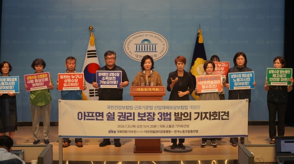 ‘아프면 쉴 권리 보장 3법’은 △상병급여를 도입하고 지급액을 최저임금 이상으로 보장하는 ‘국민건강보험법 개정안’, △유급병가를 도입하고 평균임금 해당 금액을 지급하도록 하되 일정한 경우 국가가 질병휴가급여를 지급해 사용자의 부담을 덜어주는 ‘근로기준법 개정안’, △업무상 재해 인정 및 산재 요양급여 결정 전 ‘국민건강보험법’의 상병급여를 우선적으로 지급받을 수 있도록 하는 ‘산업재해보상보험법 개정안’을 말한다.