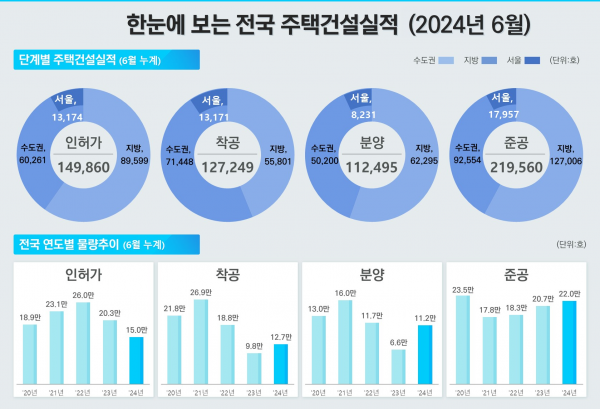 반면, 주택 준공은 2024년 6월 기준 35,922호로 전년 동월 48,973호 대비 26.6% 감소했다.