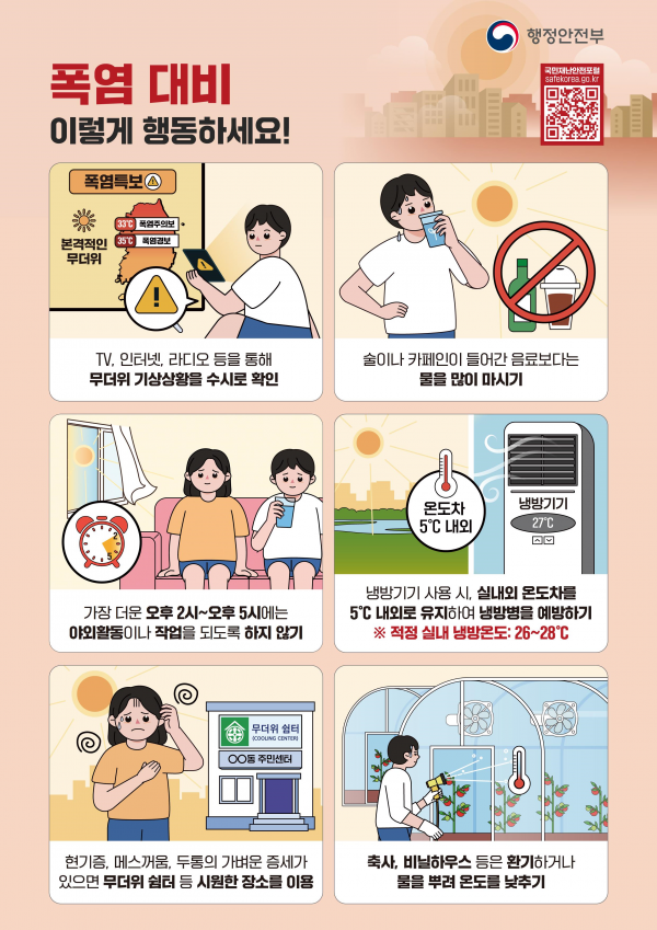 이한경 재난안전관리본부장은 “정부와 지자체는 야외 근로자 등 폭염에 취약한 국민 보호에 총력을 다하고 있다”며 “아울러 현장에서는 외국인 근로자들이 언어 소통의 어려움 등으로 폭염 피해를 입지 않도록 이들에 대한 안전교육과 홍보를 강화해 주시길 바란다”고 강조했다.