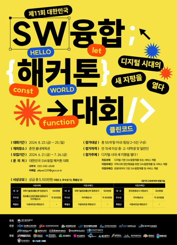 [Q뉴스] 과학기술정보통신부는 지역에서 소프트웨어를 활용한 창의적인 아이디어와 신서비스를 발굴하고 지역 디지털 혁신 성과를 확산하기 위한 제11회 ‘대한민국 소프트웨어융합 경진 대회’를 강원도 춘천시에서 8월 23일부터 25일까지 개최한다.