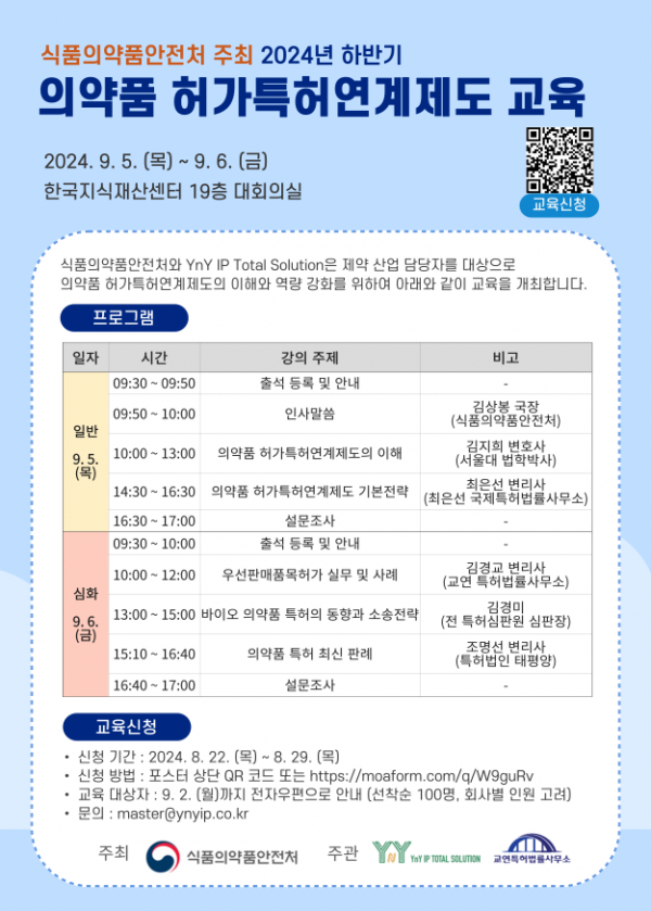 [Q뉴스] 식품의약품안전처는 제약기업 등 관련 업계 담당자들을 대상으로 ‘2024년 하반기 의약품 허가특허연계제도 교육’을 한국지식재산센터 대회의실에서 진행한다고 밝혔다.