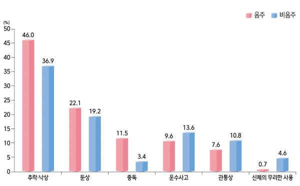 또한 음주상태에서는 중독, 추락·낙상, 둔상 등의 손상도 상대적으로 높은 발생을 보였다.