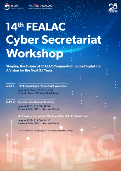 [Q뉴스] 외교부가 주최한 ‘제14차 동아시아-라틴아메리카 협력포럼 사이버사무국 워크숍’ 이 ‘디지털 대전환 시대 FEALAC의 미래 협력 방안 모색 - 향후 25년을 위한 비전’을 주제로 8.29. 서울에서 개최됐다.