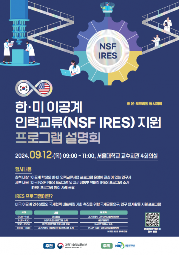 [Q뉴스] 과학기술정보통신부는 미 국립과학재단과 협력해 추진 중인 한미 이공계 인력교류 사업에 대한 설명회를 9월 12일 9시, 서울대학교 교수회관에서 개최할 예정이라고 밝혔다.
