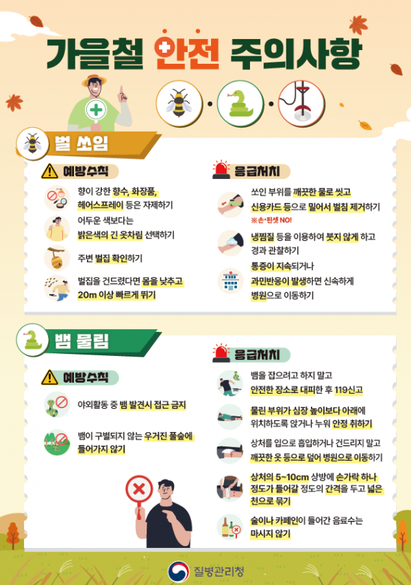 질병관리청은 응급실손상환자심층조사 분석결과를 바탕으로 가을철 빈번히 발생하는 손상에 대한 예방수칙과 응급처치법을 담은 카드뉴스 및 리플릿을 마련해 배포한다.