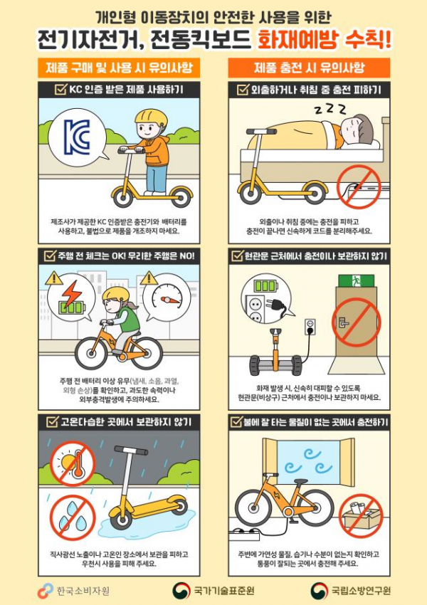 이에 국표원, 소방연구원 및 소비자원은 전기자전거와 전동킥보드 등의 안전한 사용을 위해 △ KC 인증을 받은 전동킥보드와 전기자전거 사용하기, △ 주행 전후 배터리 등 제품 이상 유무 확인하기, △ 직사광선 노출이나 고온에서 보관을 피하고 우천 시 운행하지 않기, △ 화재 발생 시 대피로 확보를 위해 비상구 근처에서 충전이나 보관하지 않기, △ 외출이나 취침 시 충전을 피하고 충전 완료 후 코드 분리하기 등을 당부했다.