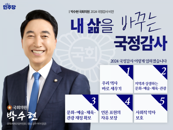 [Q뉴스] 박수현 의원이 2024년도 문화체육관광위원회 국정감사를 앞두고 26일 ‘국정감사 5대 핵심 추진과제’를 제시했다.