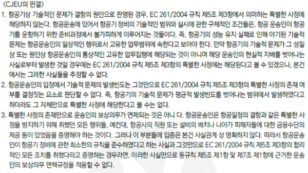 이와 관련해 CJEU는 항공기 정비와 관련된 기술적 문제, 정비 실패로 인한 문제는 ‘특별한 상황’ 으로 보지 않고 있다.