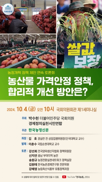 [Q뉴스] 박수현 의원이 경제정의실천시민연합 , 한국농정신문과 함께 “농정개혁 정책 제안 연속 토론회-농산물 가격안정 정책, 합리적 개선 방안은?”를 10월 4일 오전 10시 국회의원회관 제1세미나실에서 개최한다.